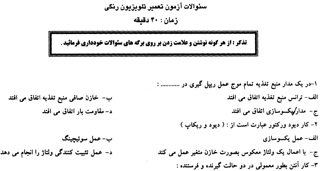 صفحه محصول - سوالات آزمون پایان دوره تعمییر تلویزیون رنگی - 4 صفحه - pdf